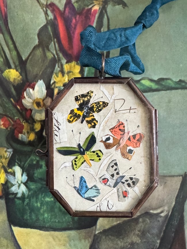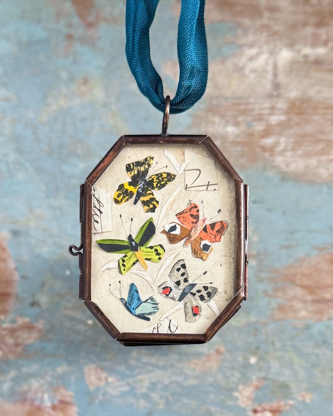 1.5" x 2" painted and antique paper collage, mixed media - framed in petite antiqued locket frame. each miniature collage features papers from the 18th and 19th centuries, as well as hand painted cotton papers.
